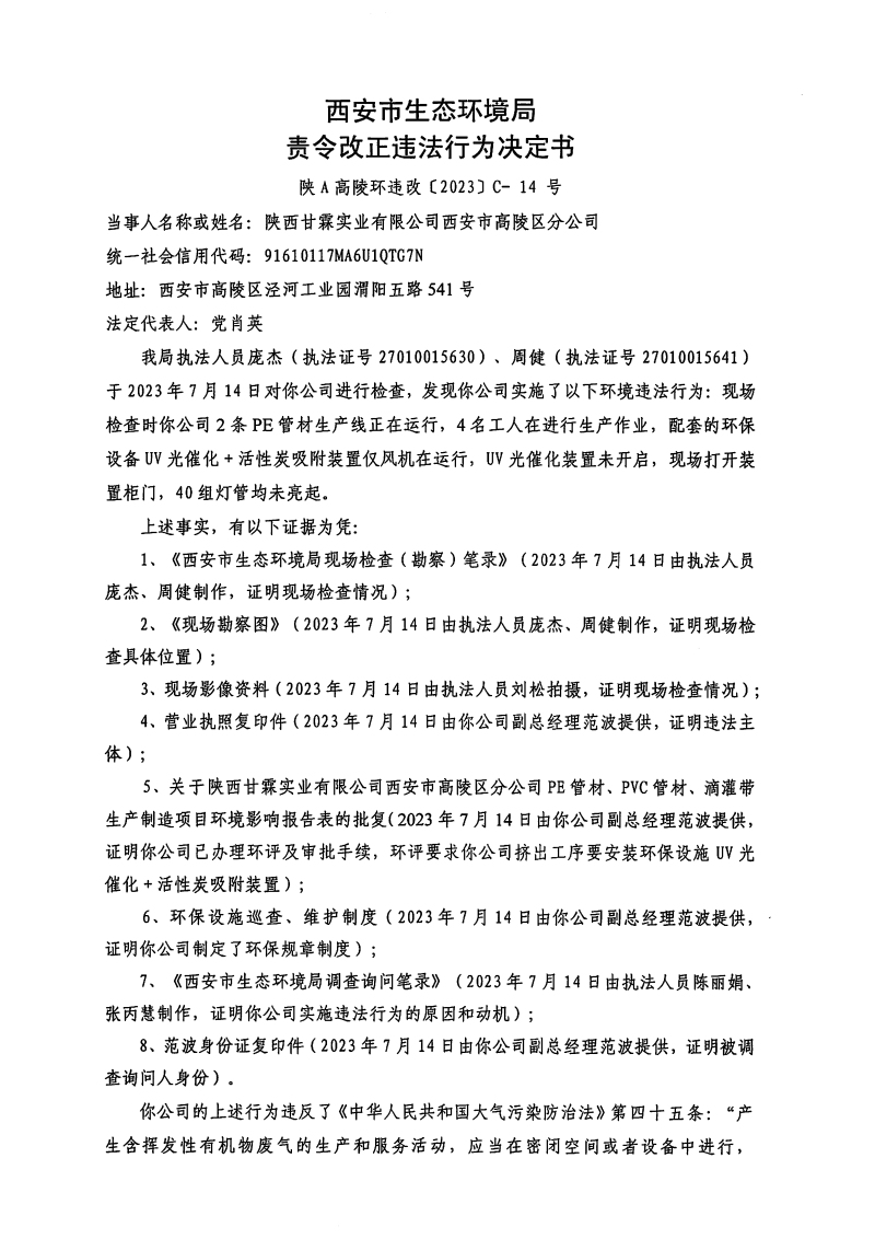 西安市生態環境局高陵分局責令改正違法行為決定書〔2023〕C-14 號