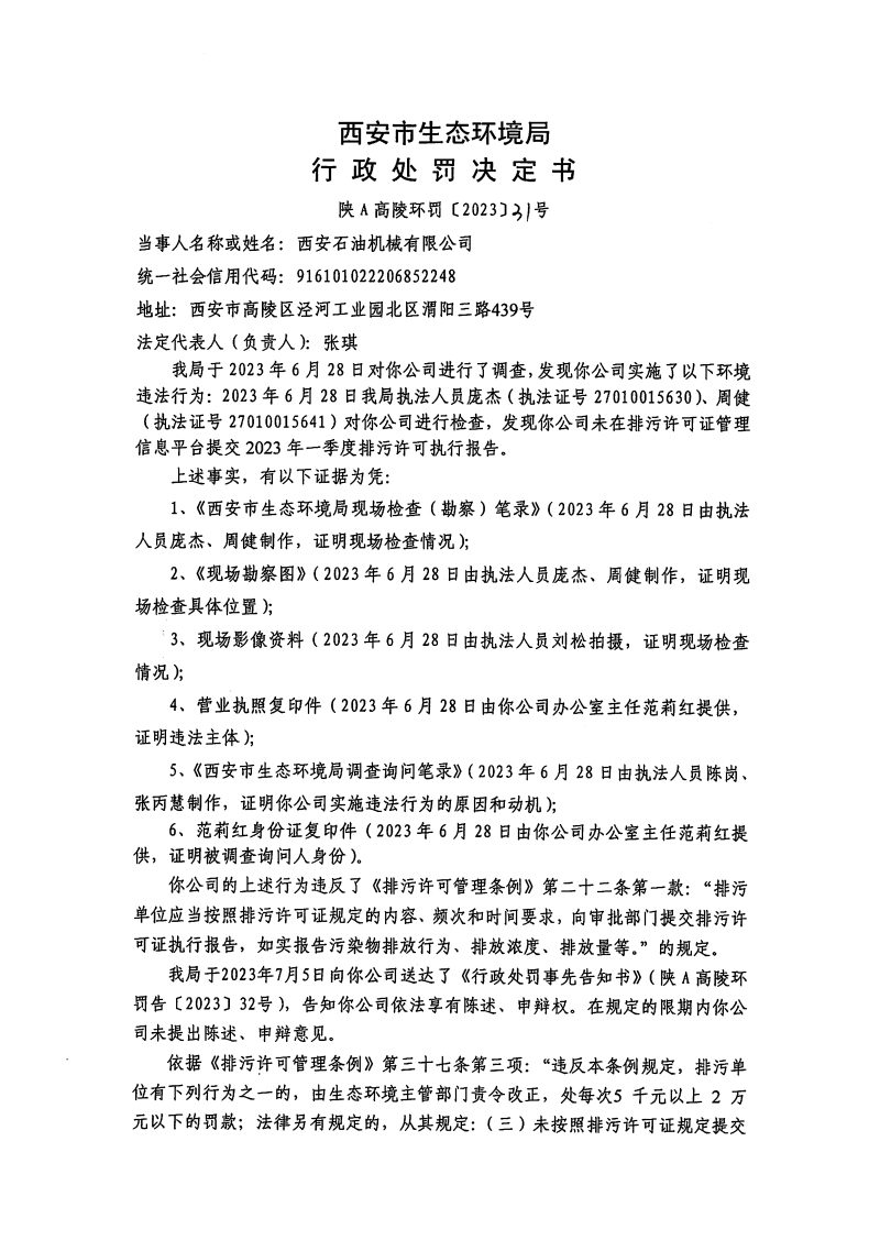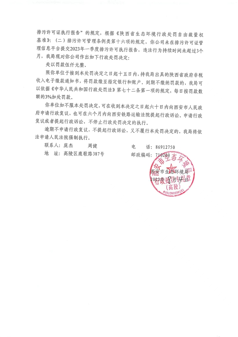 西安市生態環境局行政處罰決定書陜A高陵環罰〔2023〕31號