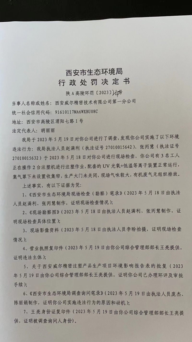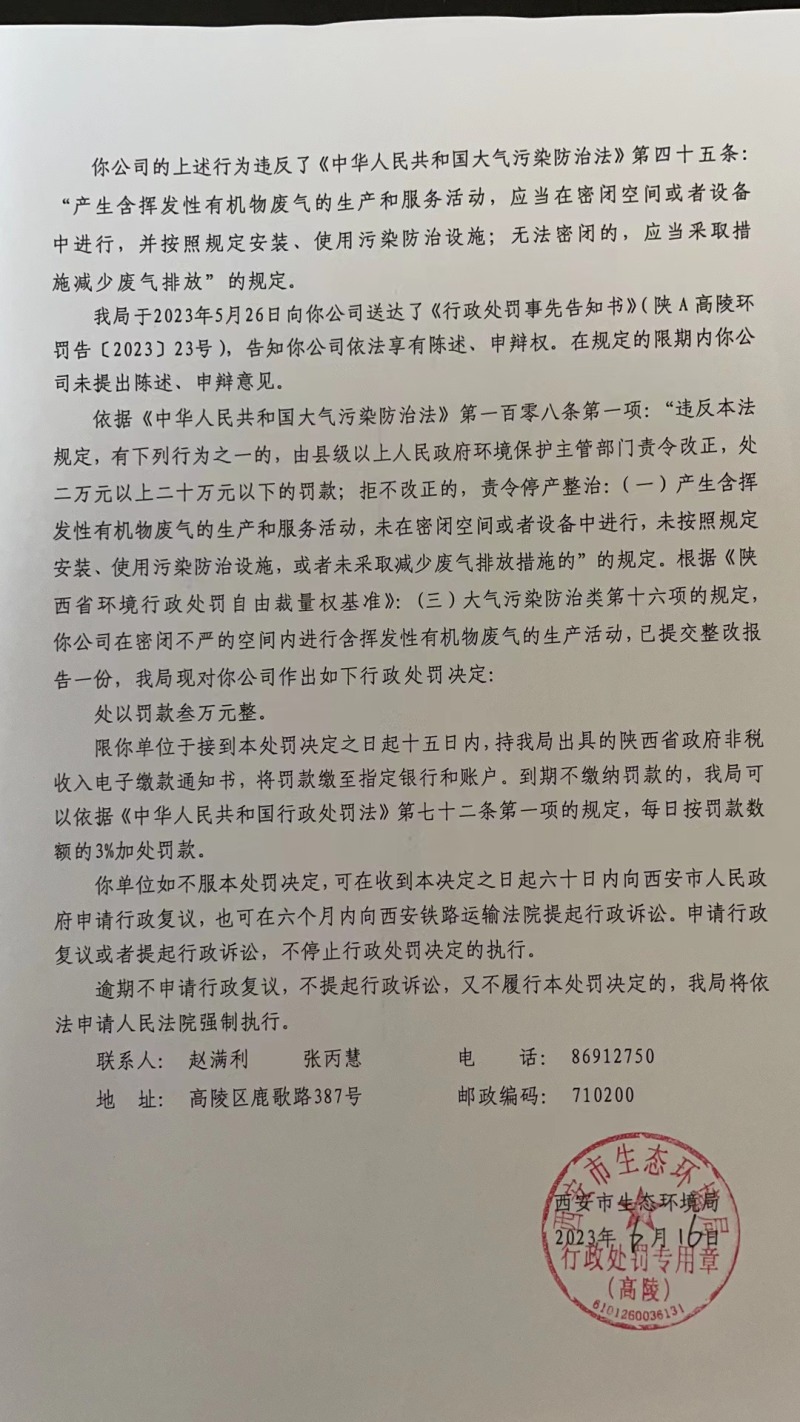 西安市生態(tài)環(huán)境局行政處罰決定書(shū)陜A高陵環(huán)罰〔2023〕24號(hào)
