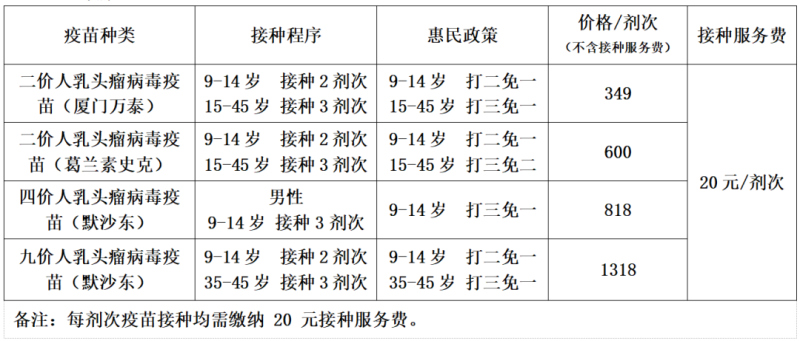 惠民政策:疫苗種類和接種程序、優惠政策見下表,打二免一即共需接種2劑次,免除1劑次疫苗費用;打三免一即共需接種3劑次,免除1劑次疫苗費用;打三免二即共需接種3劑次,免除2劑次疫苗費用,若未按規定時間接種后續劑次,將無法享受此惠民政策。