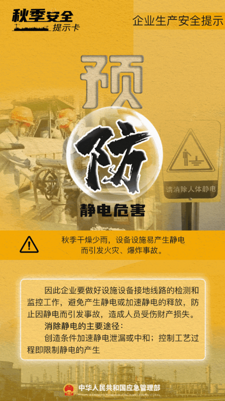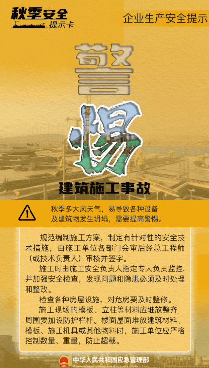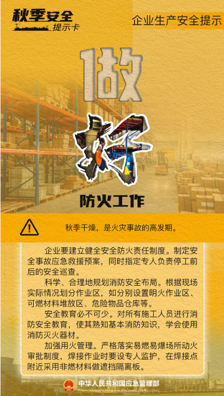 秋季晝夜溫差大,冷暖變化不規律,這些看似尋常的氣候變化往往會影響企業的安全生產工作,一些事故發生概率也會因為季節性因素而升高。俗話說“春困秋乏”,莫讓安全意識“打了盹”,這份企業秋季安全生產提示卡請收好。