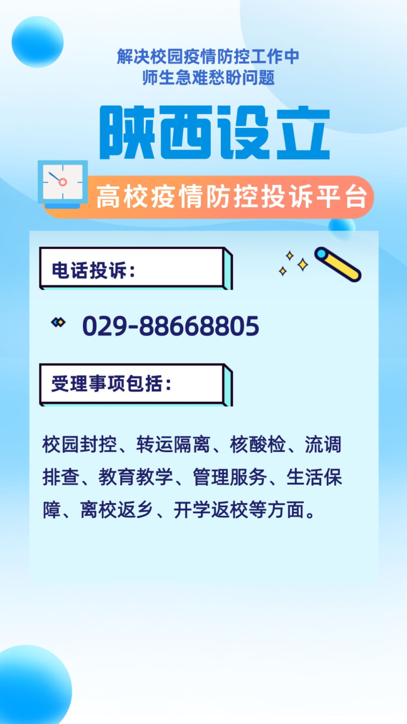 記者獲悉,各地也設立了高校疫情防控投訴平臺,其中陜西高校疫情防控投訴電話為:029-88668805。