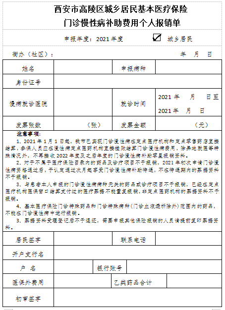 3、《西安市高陵區城鄉居民基本醫療保險門診慢性病補助費用個人報銷單》紙質版(附件1);