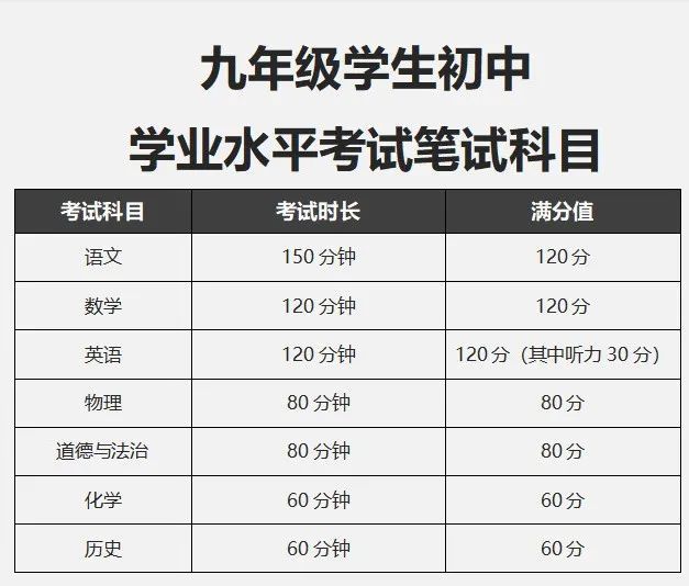 (1)全省筆試科目:語文、數學、英語、物理、化學、道德與法治、歷史,共7科7卷。各科目試卷滿分值及考試時長分別為: