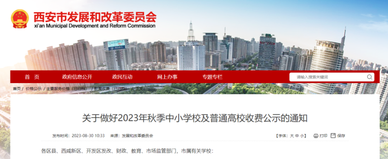 8月30日,西安市發展改革委官網發布《關于做好2023年秋季中小學校及普通高校收費公示的通知》,公布西安市2023年秋季中小學校及普通高校收費項目及標準。