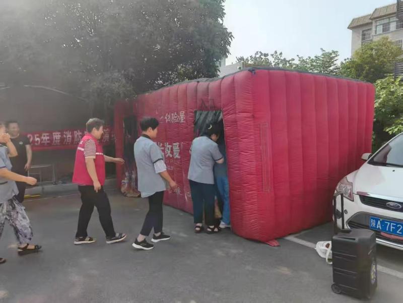 活動(dòng)開始,曙光救援的工作人員首先進(jìn)行了煙霧逃生講解。他們?cè)敿?xì)介紹了火災(zāi)發(fā)生時(shí)的正確逃生姿勢(shì)、路線選擇等關(guān)鍵技巧,幫助居民掌握基本的自救方法。隨后,在室外場(chǎng)地設(shè)置了充氣屋體驗(yàn)環(huán)節(jié)。居民們有序排隊(duì),進(jìn)入充氣屋內(nèi)模擬火災(zāi)現(xiàn)場(chǎng),在工作人員的指導(dǎo)下進(jìn)行逃生演練,親身體驗(yàn)火災(zāi)發(fā)生時(shí)的應(yīng)對(duì)方式。