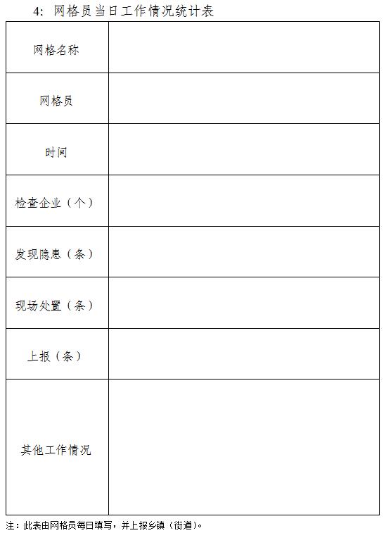 各網格主管單位、各街辦要按照實施方案的要求,完成網格劃分,力量整合,落實網格區域范圍、網格責任人,確定各個網格、責任人的安全監管職責與任務。要建立安全生產網格化監管工作的“三臺賬三報表”,即轄區內各類企業臺賬、網格內“三小場所”及家庭戶臺賬、安全生產網格建立情況臺賬、網格員當日工作情況統計表、網格員檢查記錄表、網格化監管工作月報表。(見附件2)